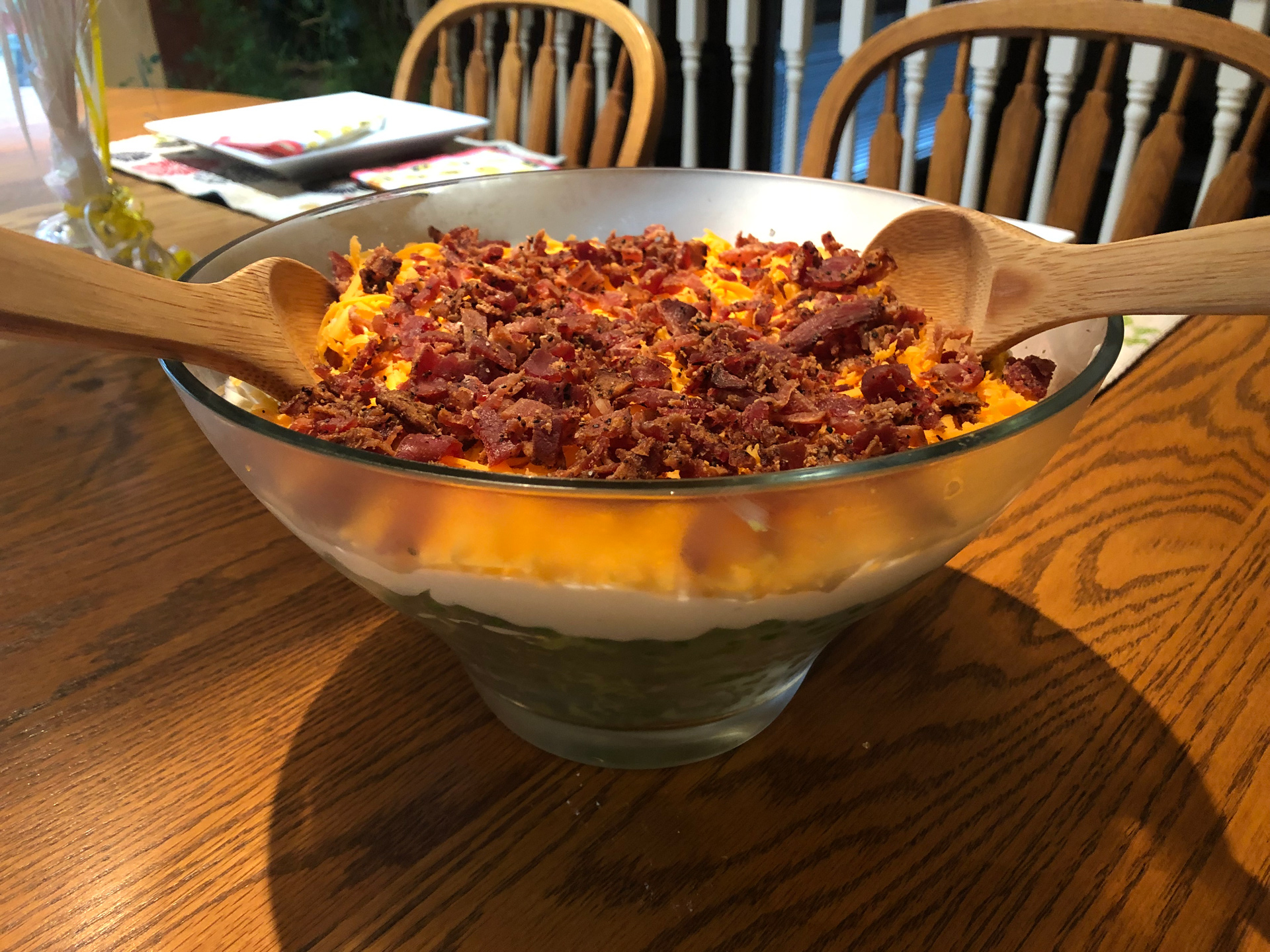 - Place lettuce in the bottom of a large bowl (or 9×13 pan).